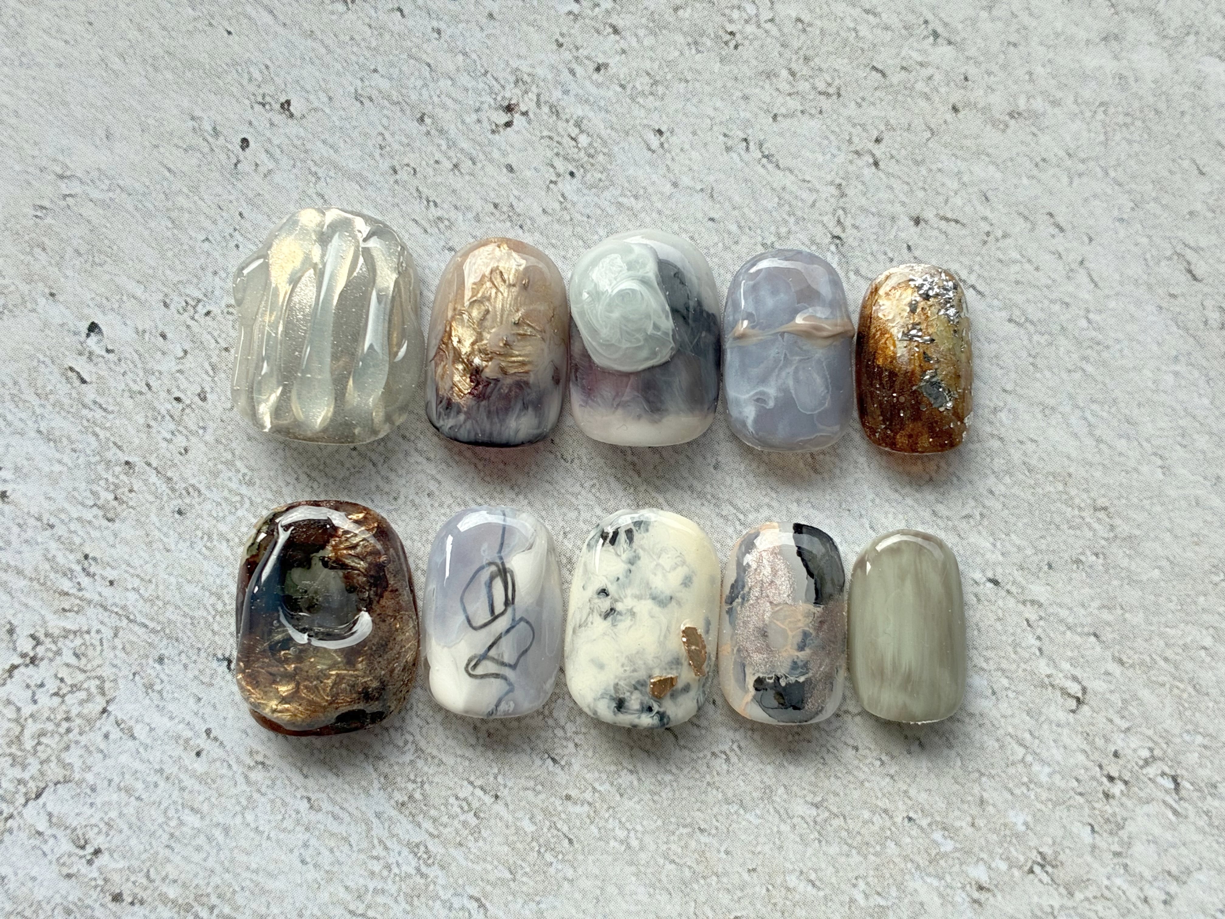 ベースカラーから仕上げには全てジェルを使用しておりますので光沢感と強度があり、ストーンや飾りは取れにくくなっております。