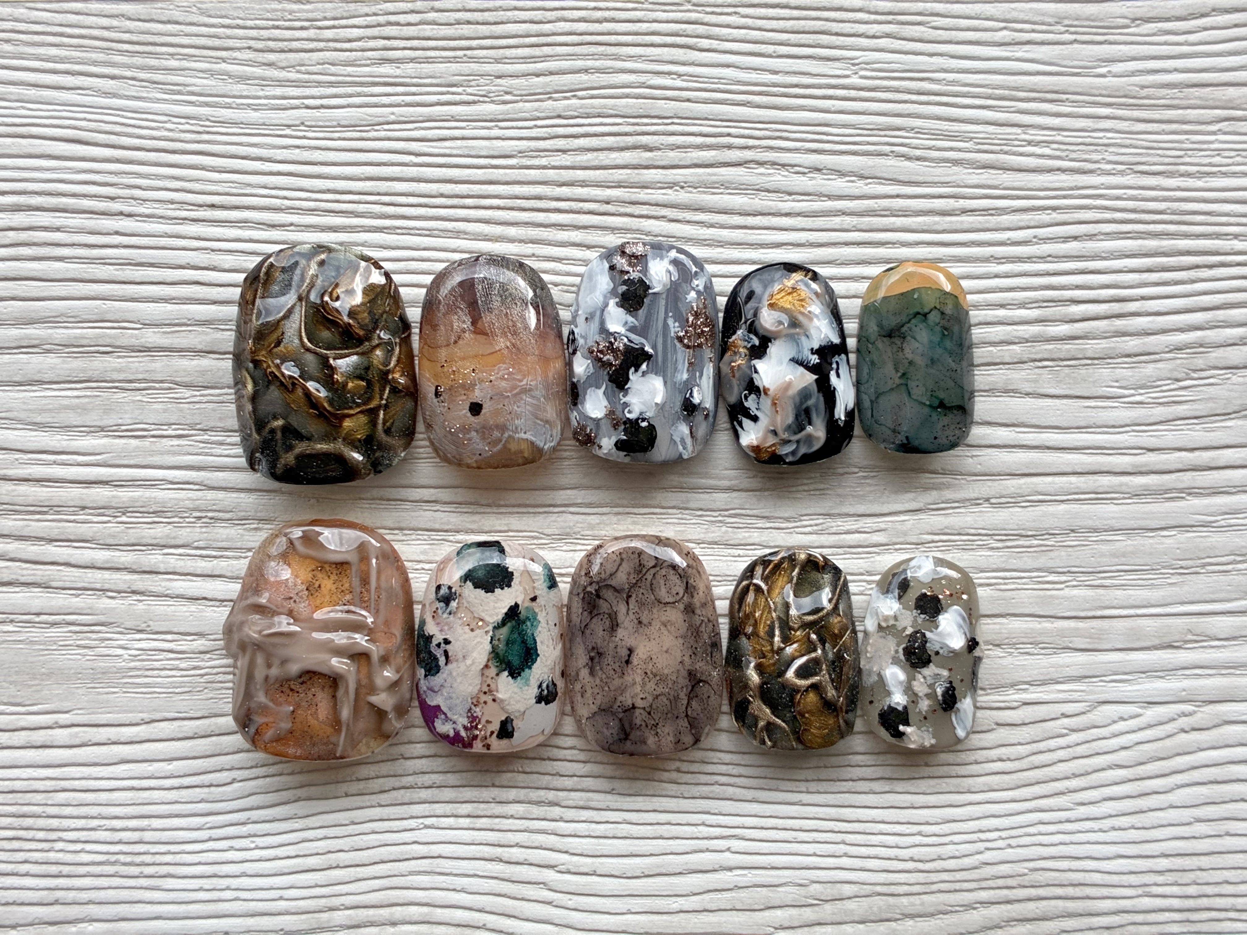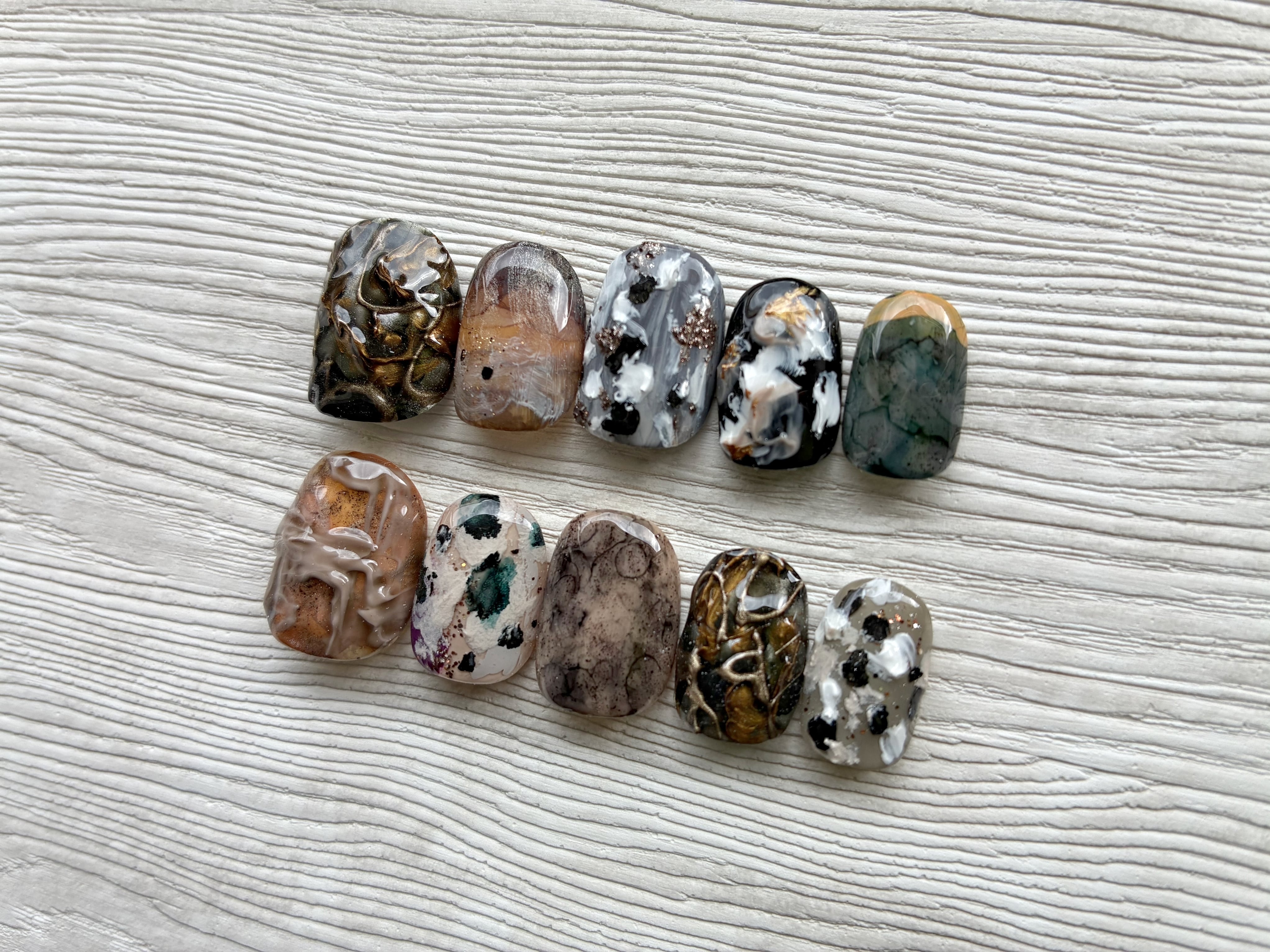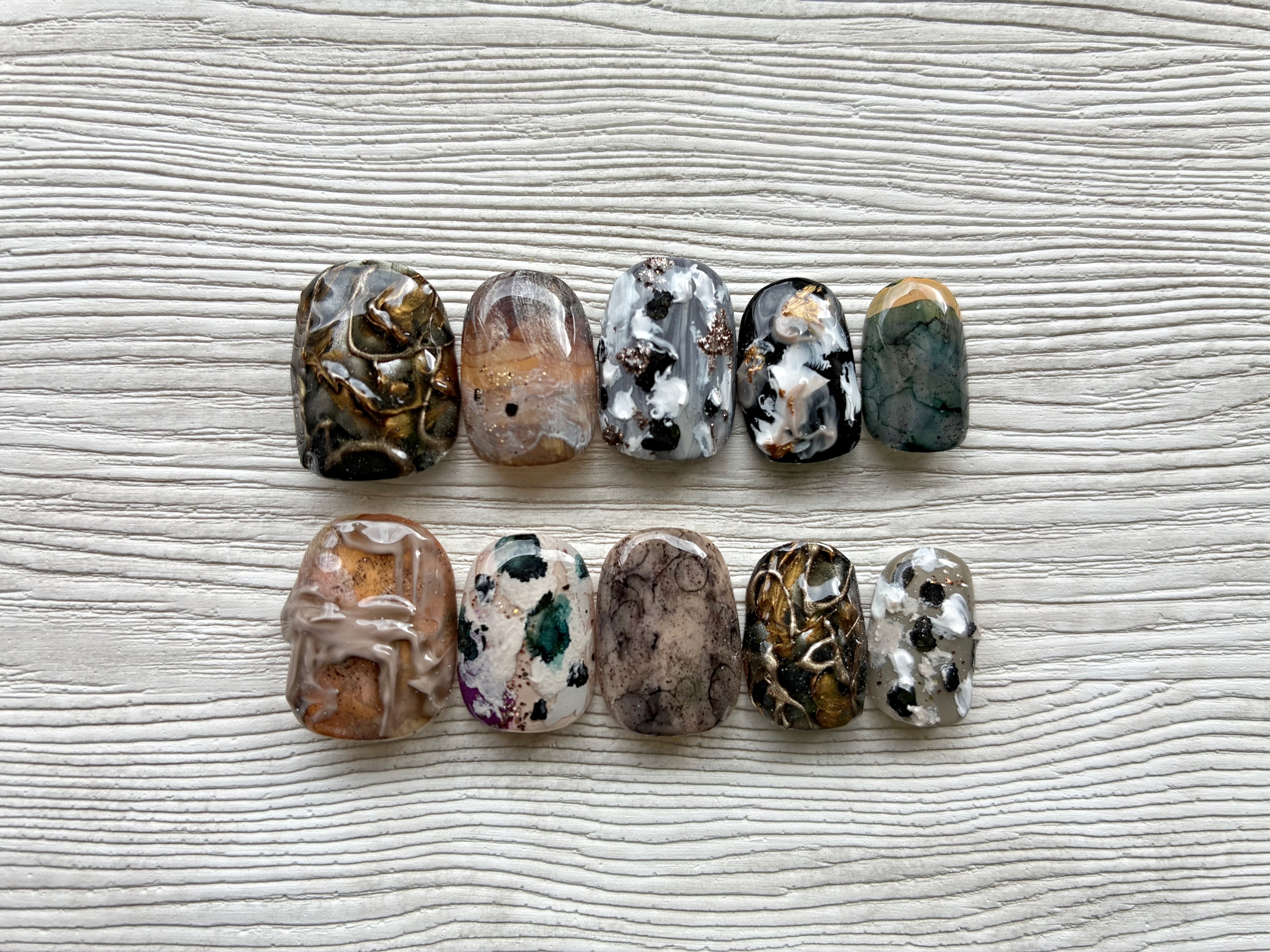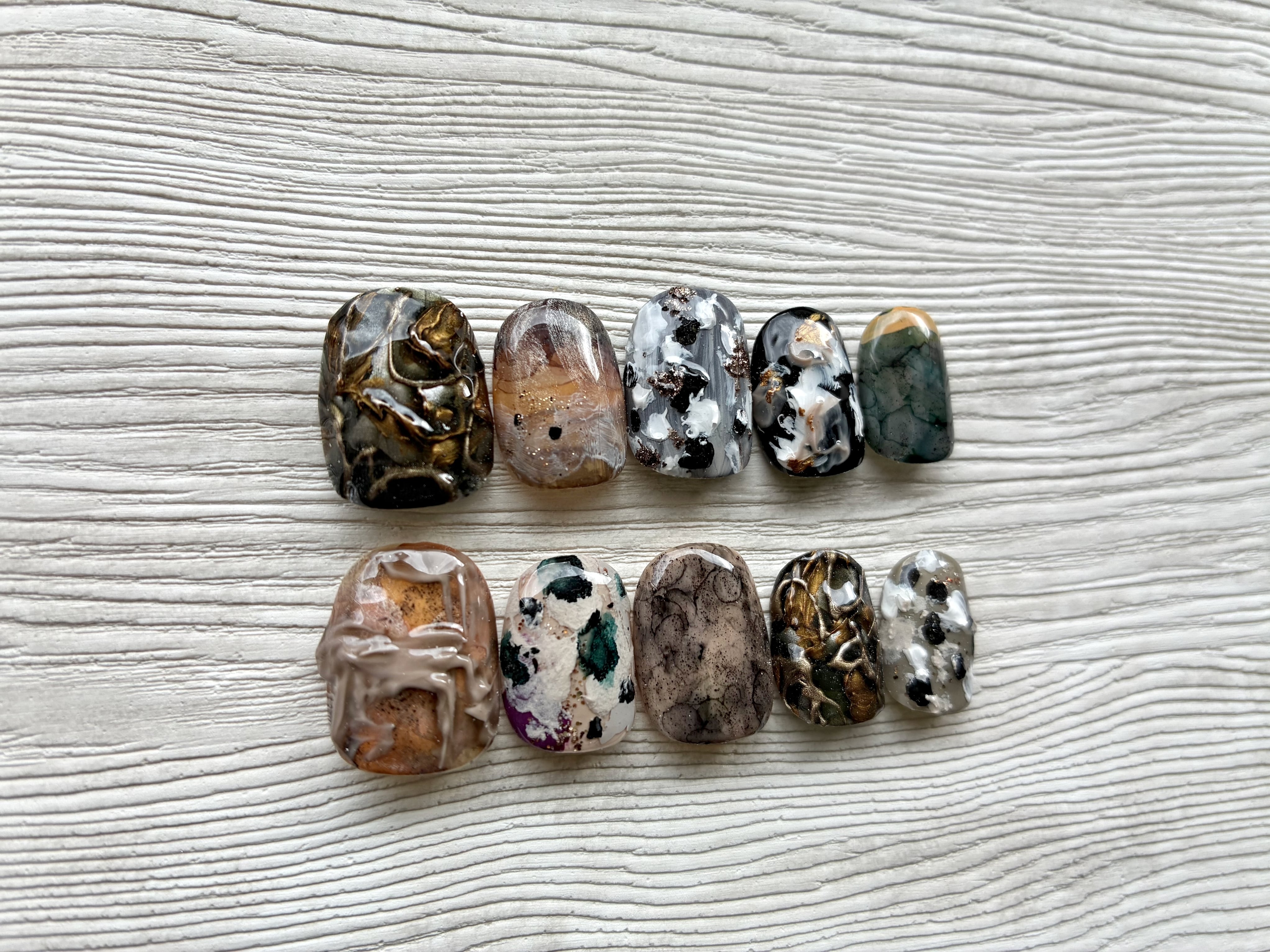 ベースカラーから仕上げには全てジェルを使用しておりますので光沢感と強度があり、ストーンや飾りは取れにくくなっております。